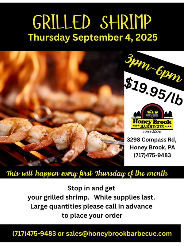 Juicy Tasty Fresh Grilled Shrimp. Every 1st Thursday of the month. Dont miss out. Stop in 3pm-6pm to get yours