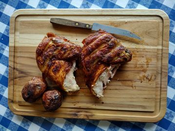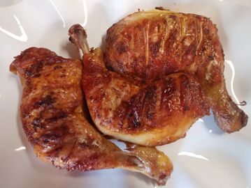 Juicy smoked chichen halves deliciously seasoned and cooked in our heated grill with the skin side facing up.