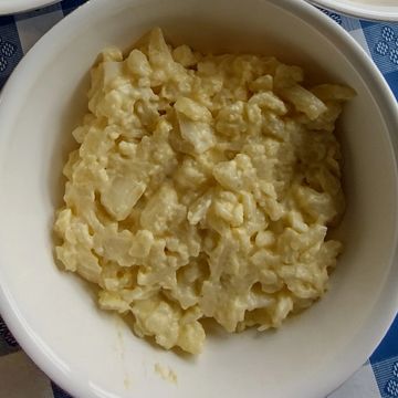 Made from boiled potatoes, containing a dressing and a variety of other ingredients such as boiled eggs and raw vegetables. See price
